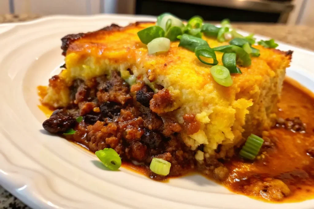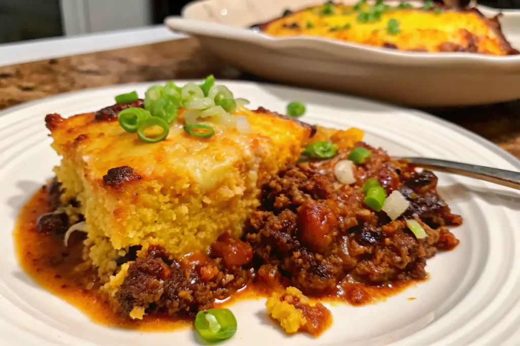 A bold and comforting Tex-Mex casserole with seasoned beef, chili beans, and a golden cheesy cornbread topping, perfect for family dinners or gatherings.